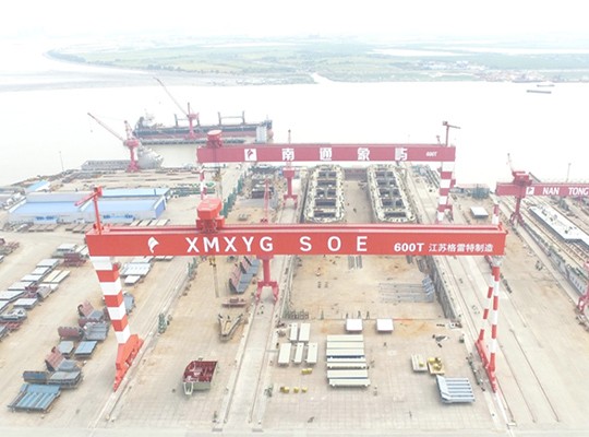 造船(chuán)門(mén)式起重機(jī)是(shì)工(gōng)作(zuò)在造船(chuán)廠(chǎng)的(de)船(chuán)α塢、船(chuán)台或平台上(shàng)進行(xíng)船(chuán)體(tǐ)分(fēn)段吊裝及翻身(shēn)作(z✘uò)業(yè)的(de)專用(yòng)起重設備。