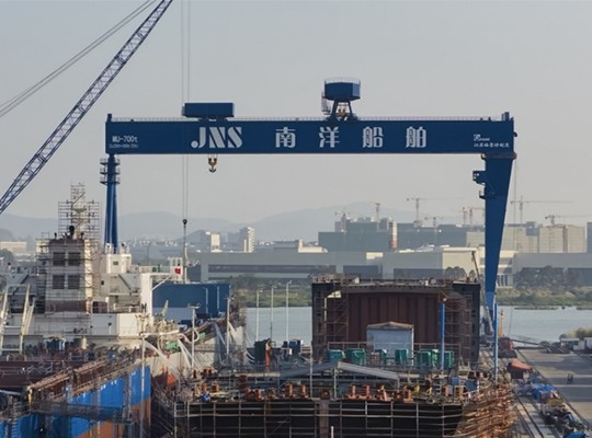 造船(chuán)門(mén)式起重機(jī)是(shì)工(gōng)作(zuò)在造船(ch÷uán)廠(chǎng)的(de)船(chuán)塢、船(chuán)台或平台上(shàng)進行(xín♠g)船(chuán)體(tǐ)分(fēn)段吊裝及翻身(shēn)作(zuò)業(yè)的(de)專用(yò✘ng)起重設備。