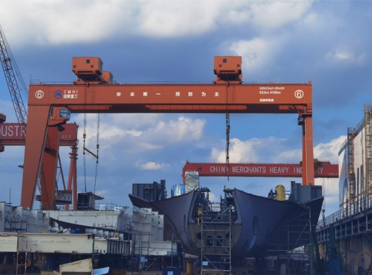 造船(chuán)門(mén)式起重機(jī)是(shì)工(gōng)作(zuò)在造船(chuán)廠(chǎng)的(de)船(chuán)塢、∏船(chuán)台或平台上(shàng)進行(xíng)船(chuán)體(tǐ)分(fēn)段吊裝及翻身(shēn')作(zuò)業(yè)的(de)專用(yòng)起重設備。