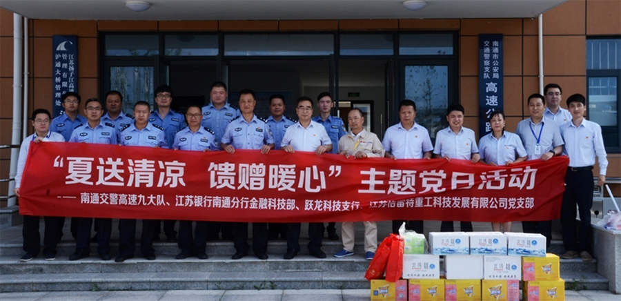 6月(yuè)29日(rì)下(xià)午,江蘇銀(yín)行(xíng)南(nán)通(tōng)分(fēn)行(xíng)金(jīn)融科(kē)技(jì)部、躍龍科(kē)技(jì↓)支行(xíng)黨支部,聯合長垣縣億騰起重配件有限公司黨支部、江蘇格雷特重工(gōng)科(kē)技(jì)發展有(yǒu)限公司黨員(yuán)同α志(zhì),共同舉辦“夏送清涼 饋贈暖心”主題黨日(rì)活動。兩支黨員(yuán)隊伍在各自(zì)黨支部書(shū)記的(de)帶領下(xià),來(lái)到( dào)南(nán)通(tōng)交警高(gāo)速九大(dà)隊,為(wèi)交警同志(zhì)送上(shàng)一(yī)份夏日(rì)的(de)清涼∞。
